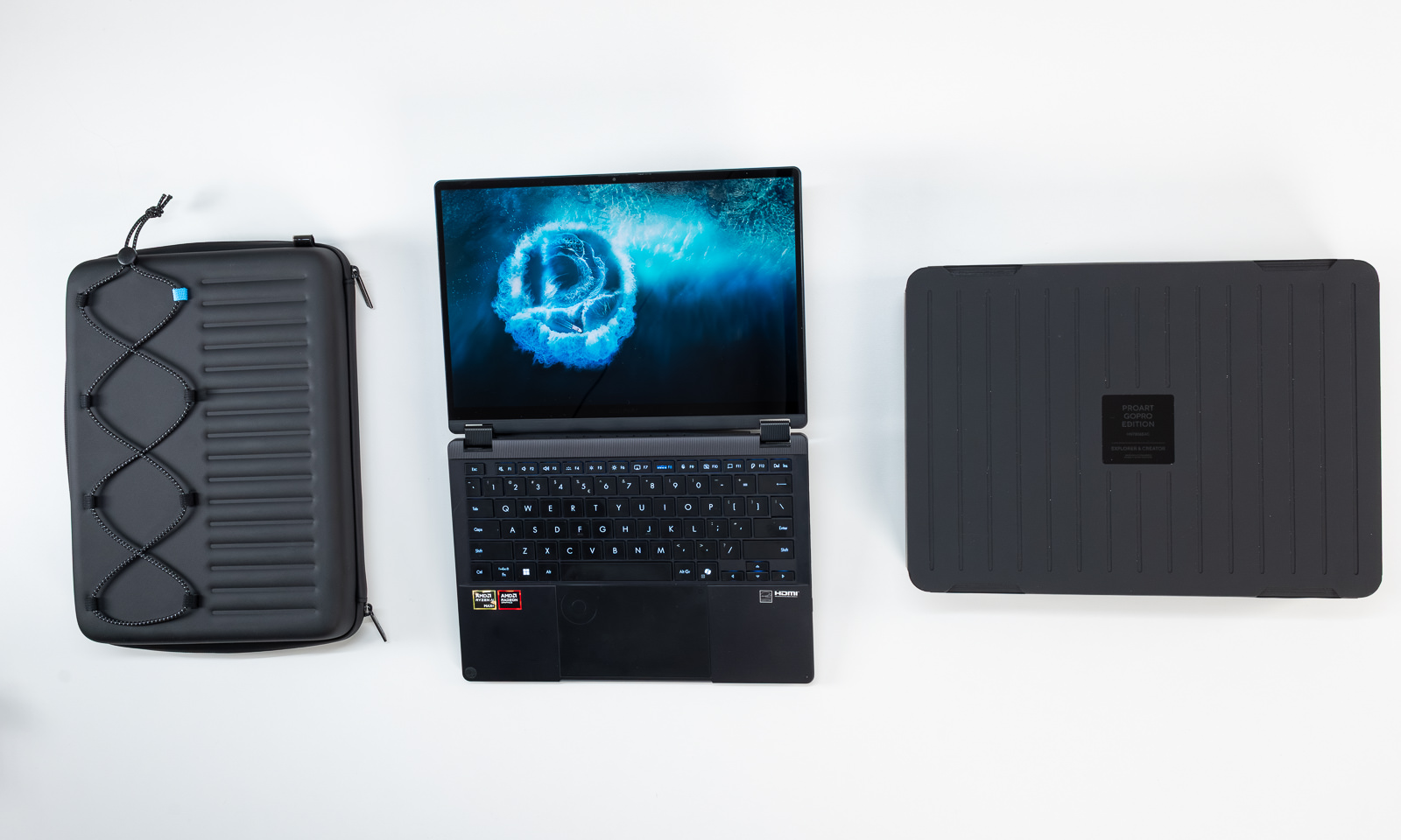 Spre deosebire de varietatea „laptopurilor de grădină”, această ediție este destinată aventurilor, motiv pentru care utilizatorii au nevoie de o protecție mai mare pentru laptopul lor ProArt GoPro Edition. Designerii ASUS au adăugat o husă rigidă inspirată de designul ambalajului GoPro. Carcasa rigidă învelește laptopul pentru a-l proteja de căderi și lovituri atât în timpul aventurilor speciale, cât și în timpul utilizării zilnice. Husa rigidă are, de asemenea, modele frezate CNC care evidențiază sofisticarea și durabilitatea produsului, în timp ce cureaua multifuncțională ține în siguranță o cameră GoPro cu gadgeturi și alte accesorii.