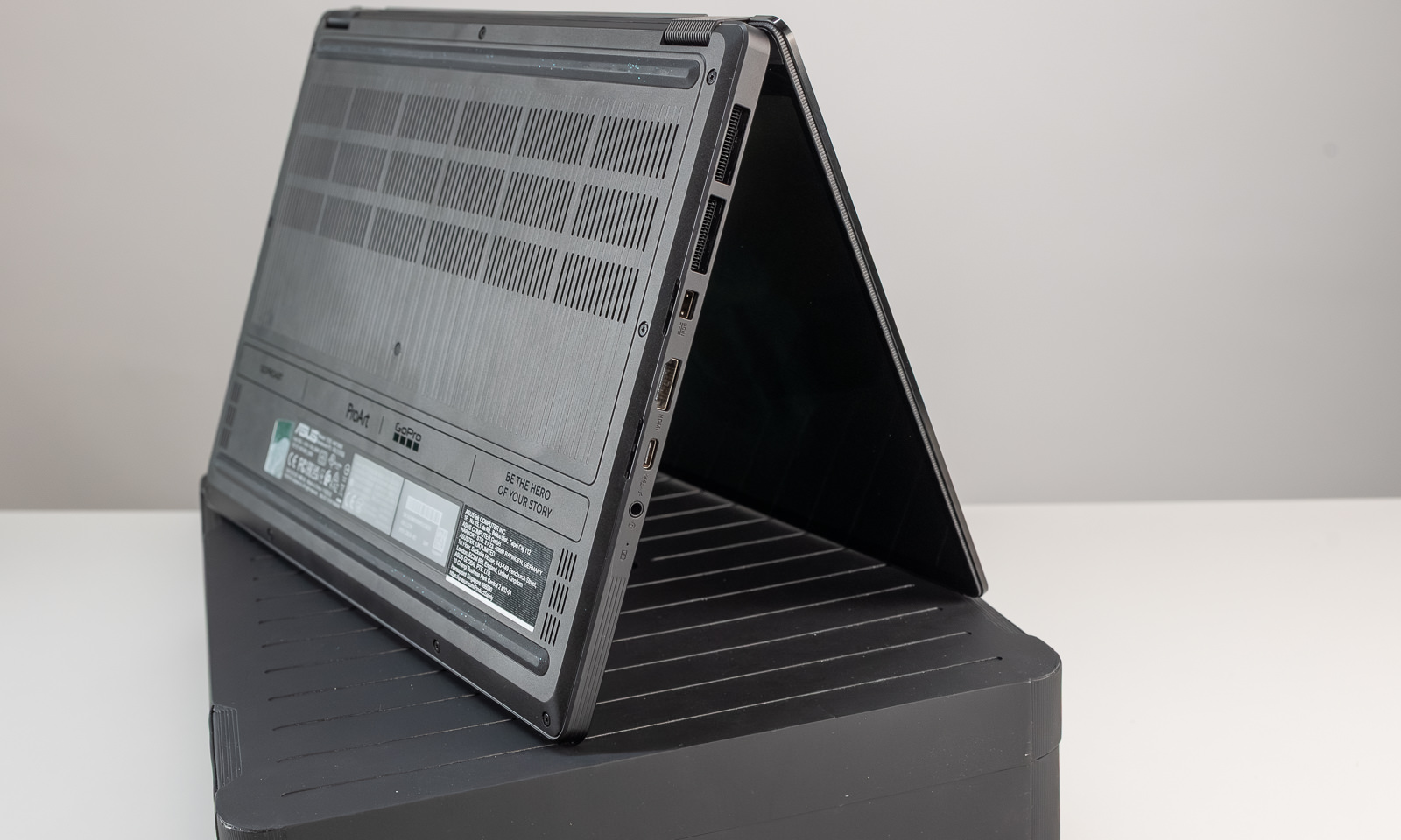 Creatorii mai aventuroși fac tot ceea ce fac utilizatorii obișnuiți, dar pun un accent special pe durabilitate. Prin urmare, ProArt GoPro Edition nu numai că are un design îndrăzneț din metal negru cu accente inspirate de GoPro, dar încorporează și un model distinctiv pe capac. Designul cu linii drepte transmite un sentiment de funcționalitate și rezistență, oferă o aderență îmbunătățită și menține o estetică curată și elegantă.
